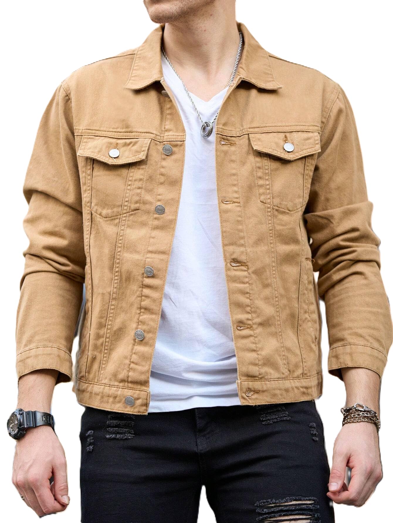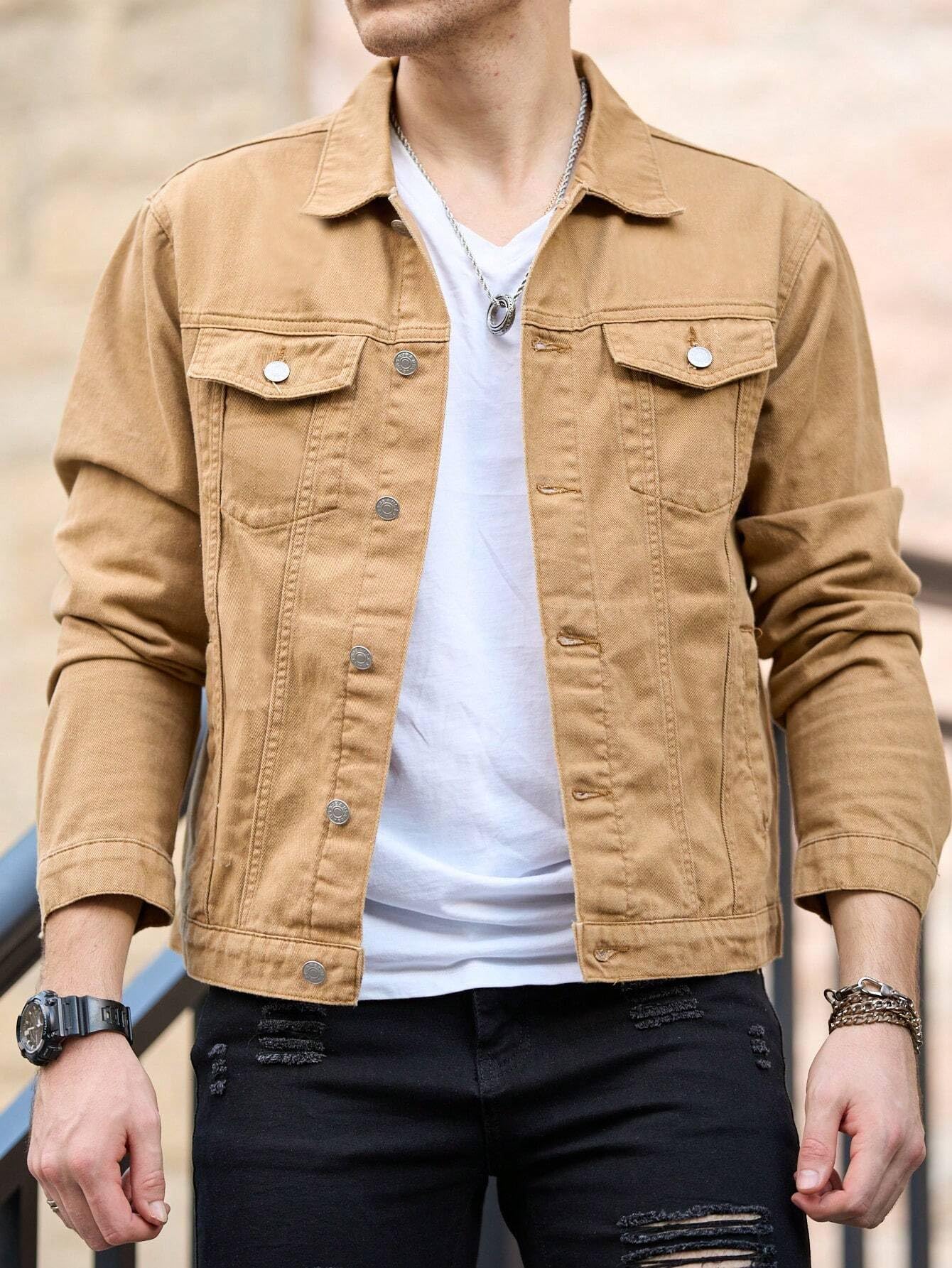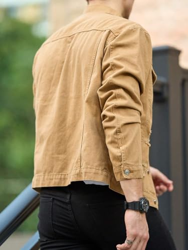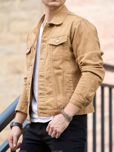 The Men’s Standard Length Cotton Blend Stretch Denim Jacket embodies timeless style and versatility. Perfect for casual or semi-formal occasions, its neutral khaki color pairs effortlessly with a variety of outfits, making it a go-to choice for every man’s wardrobe. Whether you’re dressing up for a dinner event or keeping it laid-back during a meet-up with friends, this jacket promises to elevate your look without compromises.