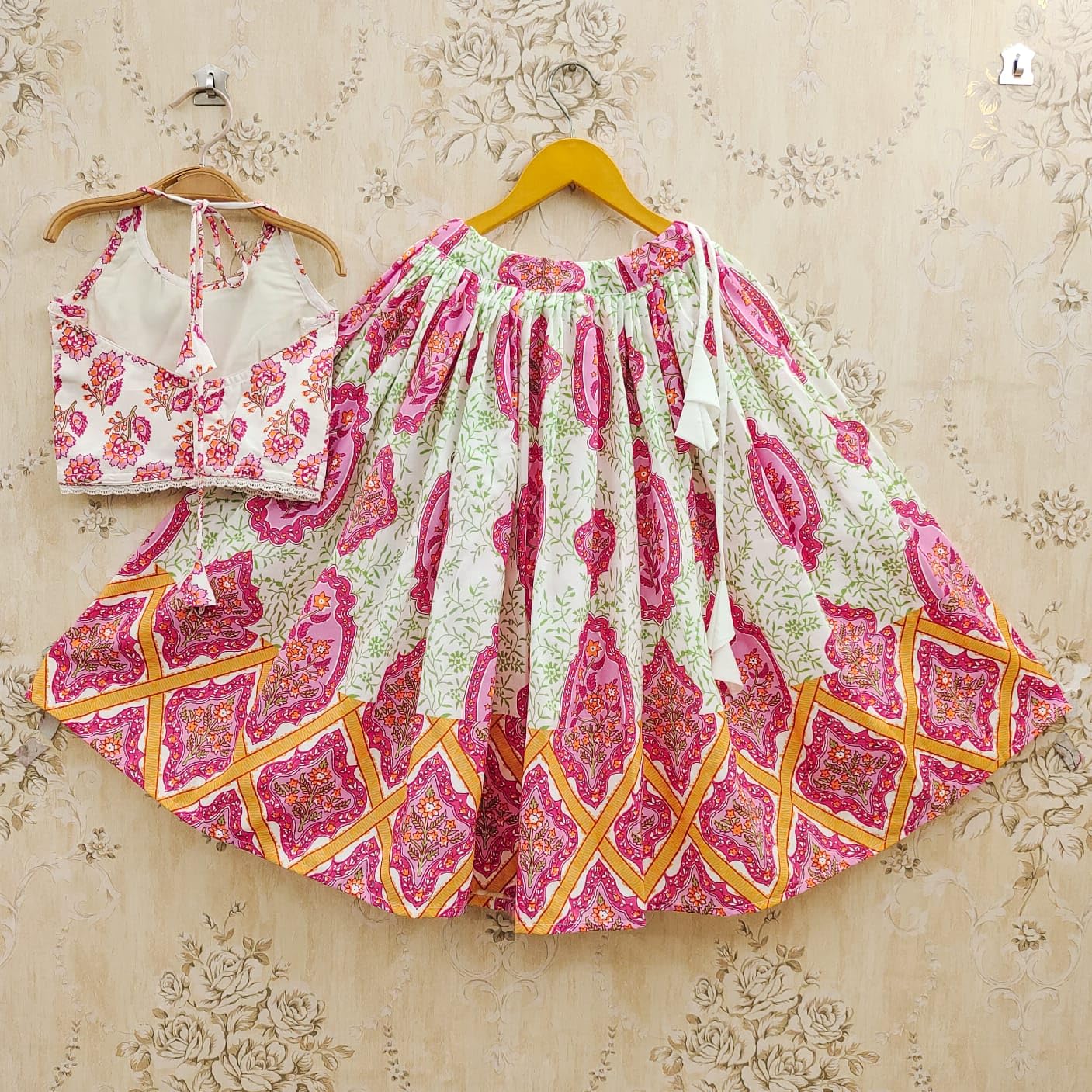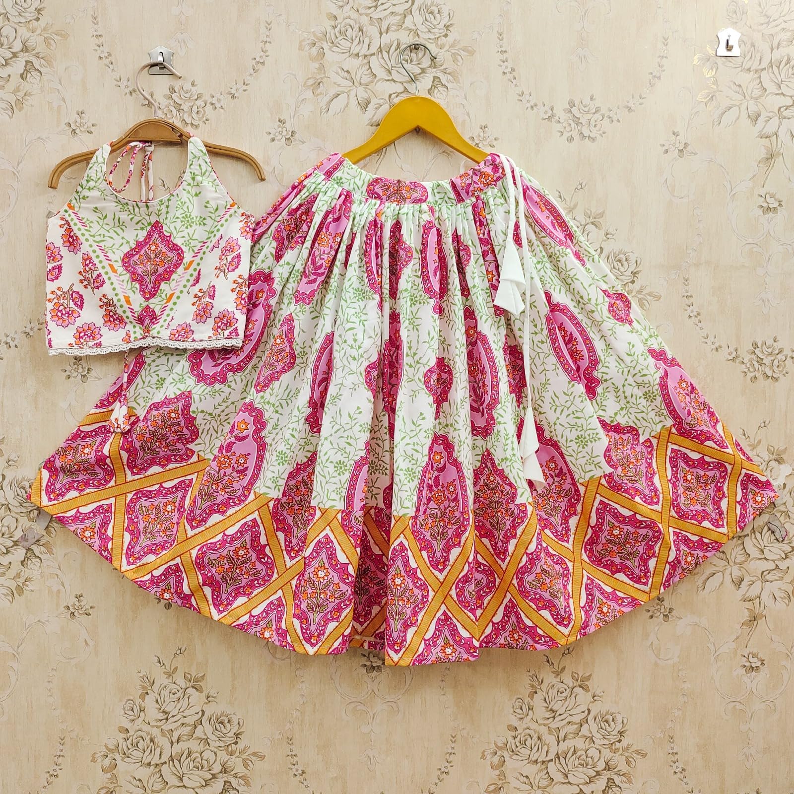 Let your princess shine in this beautiful kids’ lehenga choli set crafted in rayon fabric with a soft crepe inner lining. Designed with a halter neck printed choli and a wide flared skirt, this outfit blends comfort with style, making it perfect for festive and party occasions. The rayon fabric keeps it breathable and lightweight, while the crepe lining ensures extra comfort for long wear. This lehenga choli is suitable for Indian weddings, festive celebrations, Navratri, Diwali, Raksha Bandhan, birthdays, and family gatherings. If you’re looking for kids lehenga choli, girls ethnic wear, festive outfits for kids, or traditional dresses for girls, this rayon lehenga set with crepe inner is the perfect choice to make your little one stand out with elegance.