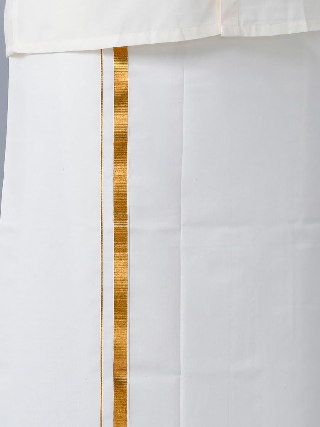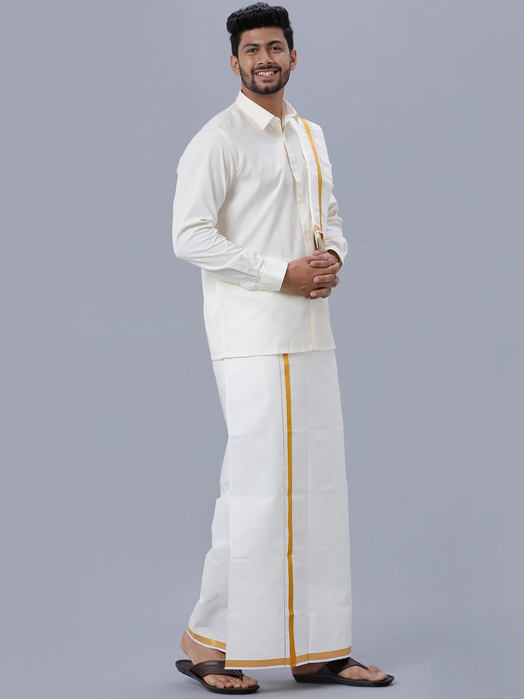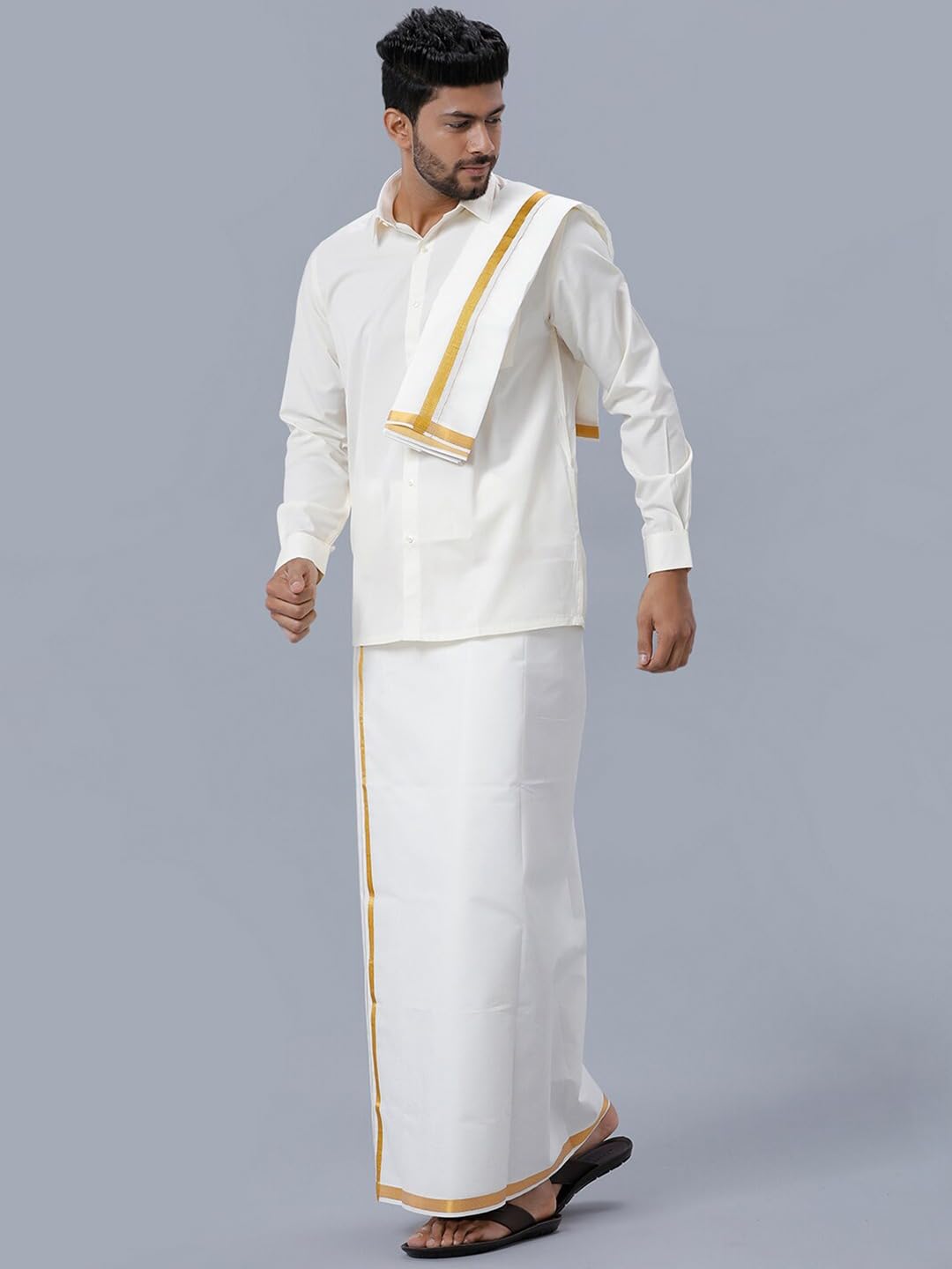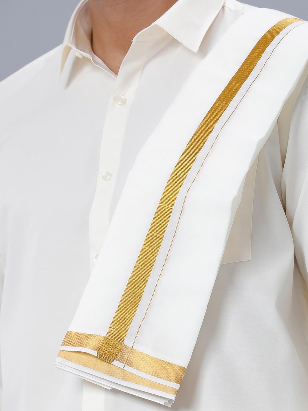 - Gold jari Border & Dhoti size: The gold jari border adds a touch of elegance and traditional appeal, making it suitable for formal occasions and ceremonies. A dhoti with the dimension 1.27mX2.00m & Towel Dimensions : 0.85 m X 1.75 m can be worn comfortably with different styles